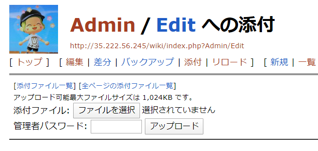 wiki画面上部メニューの[添付]をクリックすると下記の画面になります。