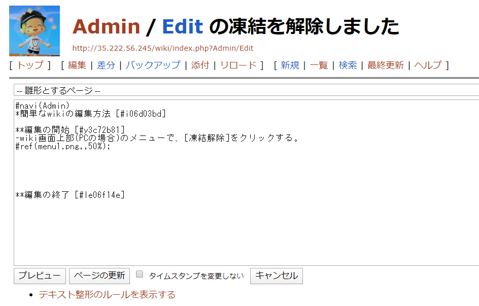 wiki画面上部(PCの場合)のメニューで、[凍結解除]をクリックします。